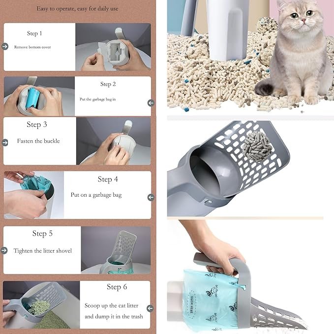 • มีช่องจ่ายถุงในตัว: ที่ตักอึมีช่องใส่ถุงอัตโนมัติในตัว เพื่อการกำจัดของเสียแมวอย่างถูกสุขอนามัย
