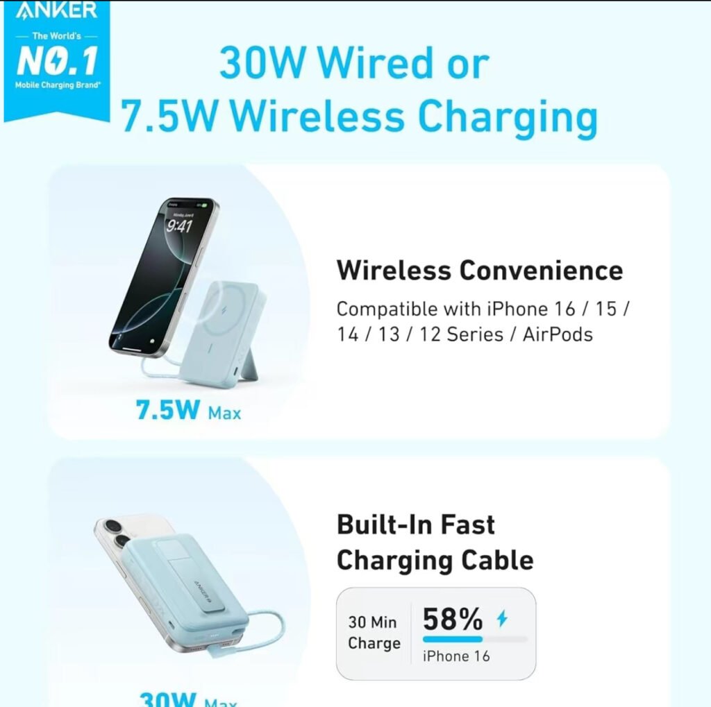Anker Zolo 10,000mAh แบตเตอรี่สำรองแม่เหล็ก ความจุสูง 30W พร้อมสาย USB-C ในตัว ปรับมุมได้ ใช้ได้กับ iPhone 17/16/15 และรุ่นอื่น ๆ